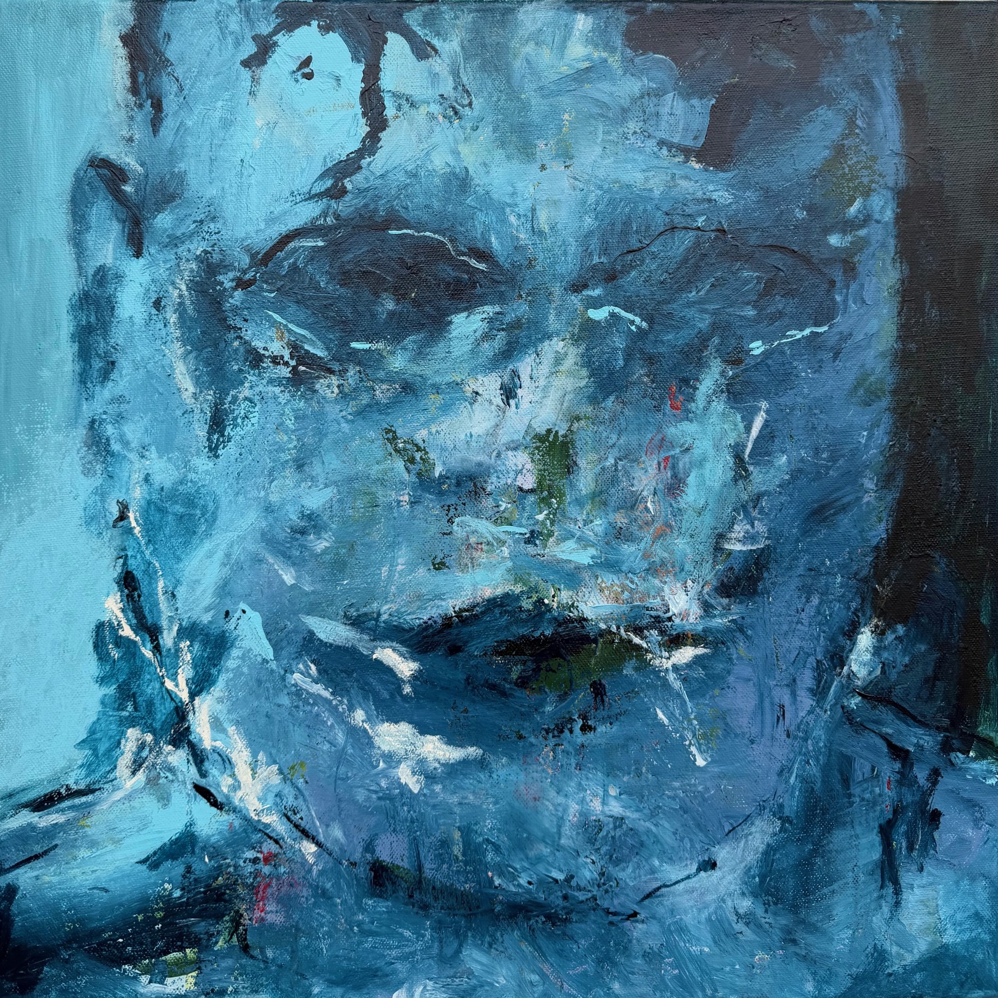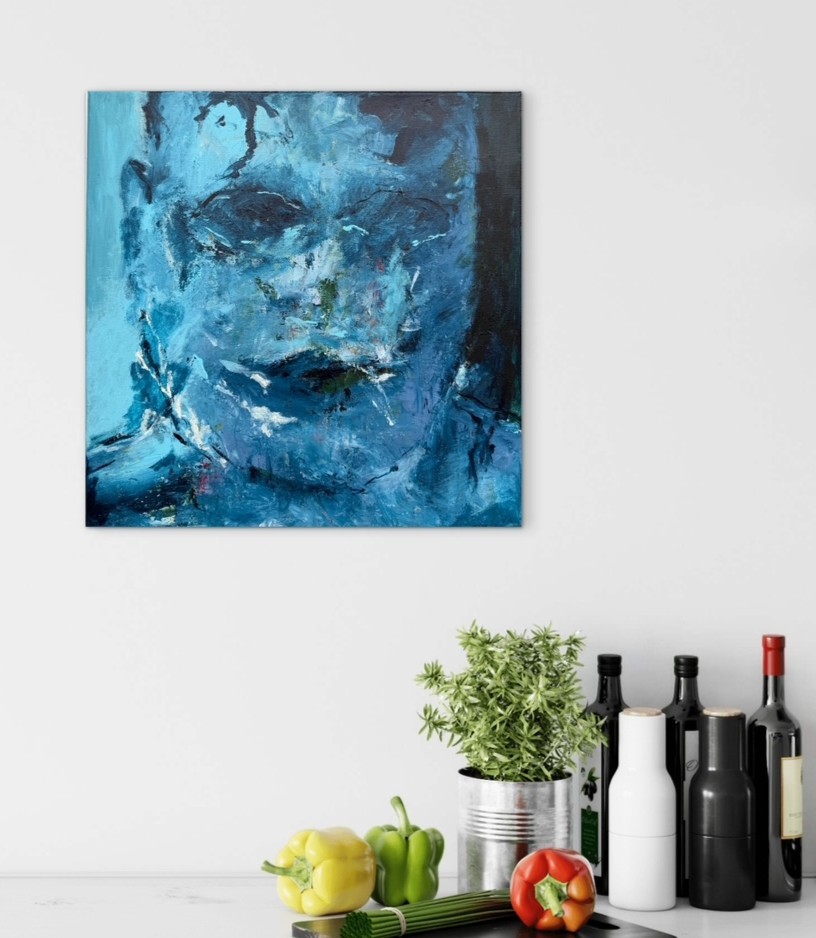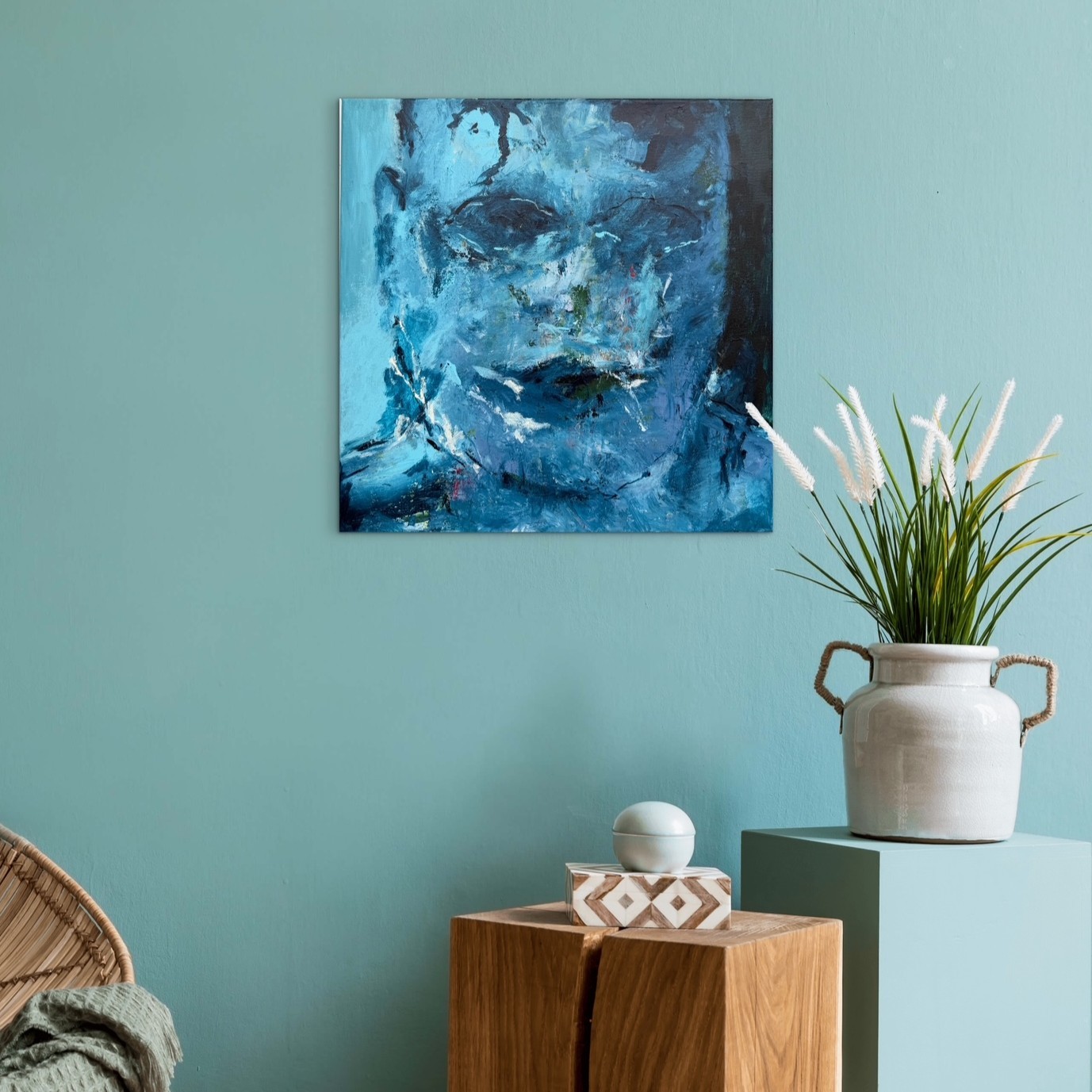 “Blue Soul” er et originalt, abstrakt portræt, hvor dybe blå nuancer og rå, ekspressive penselstrøg skaber en intens og nærværende stemning. Ansigtet træder frem af de mange lag som en rolig tilstedeværelse – både sårbar og stærk på samme tid. De kølige toner giver værket en eftertænksom karakter, mens de lysere spor og teksturelle kontraster tilfører liv og bevægelse.