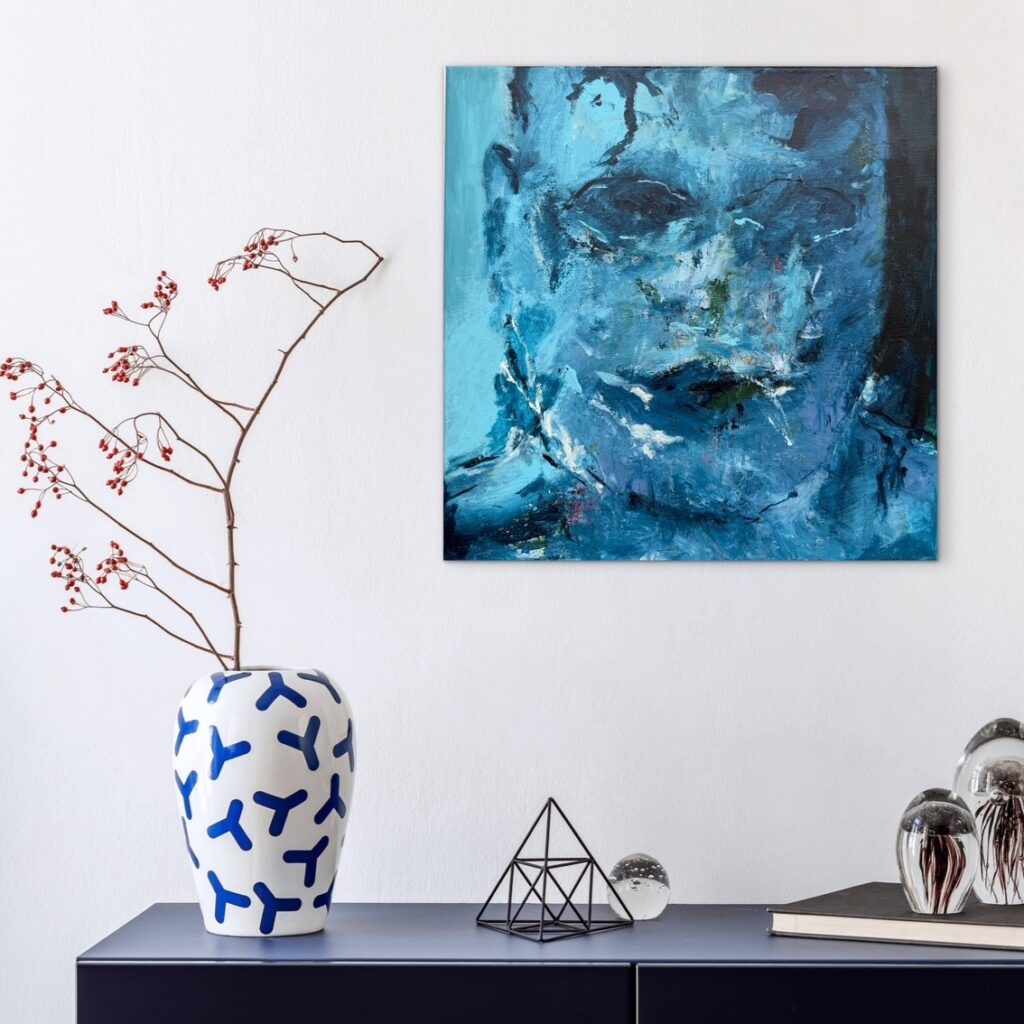 “Blue Soul” har en stærk visuel tilstedeværelse og fungerer som et stemningsfuldt fokuspunkt i ethvert rum. Et værk, der både skaber ro og vækker eftertanke.
