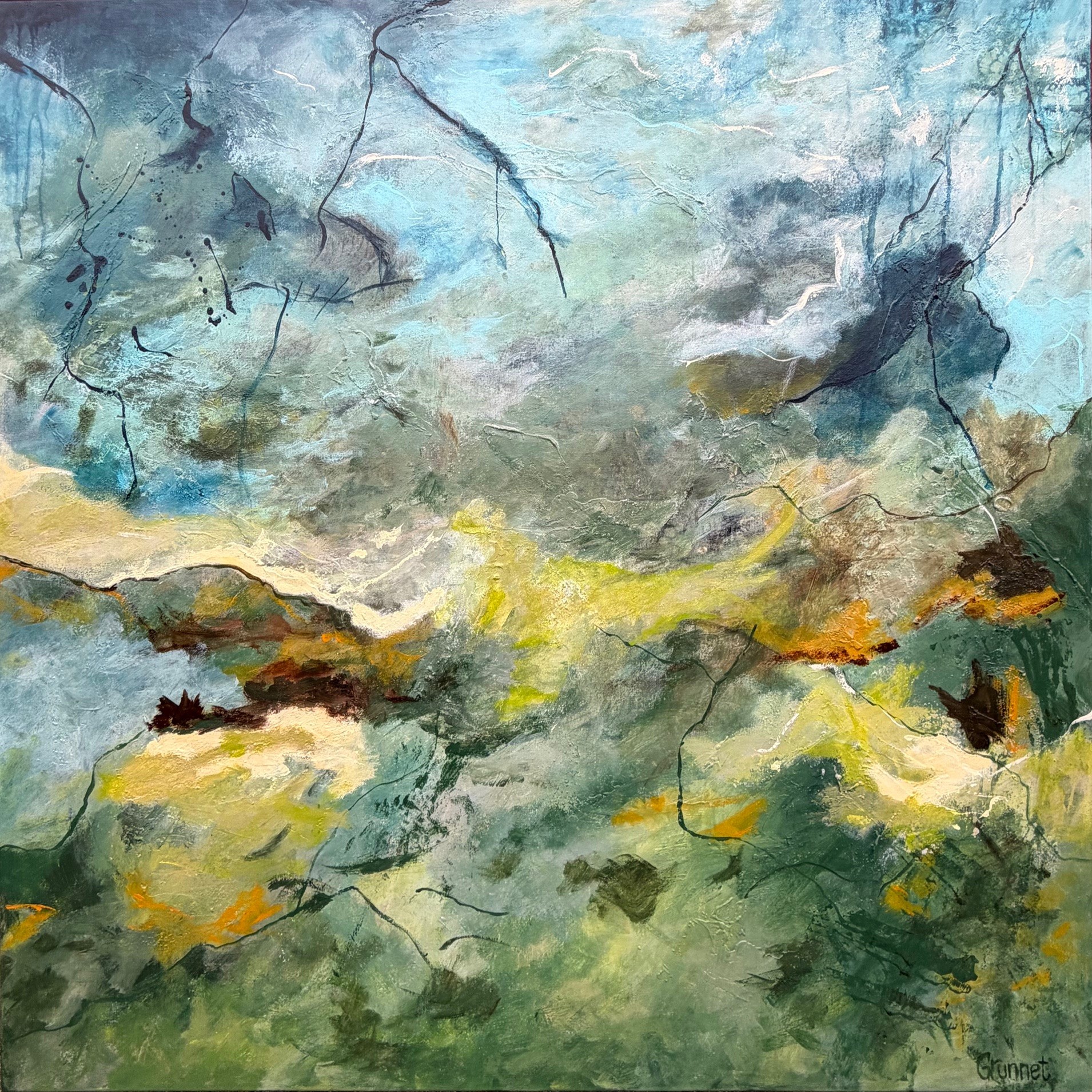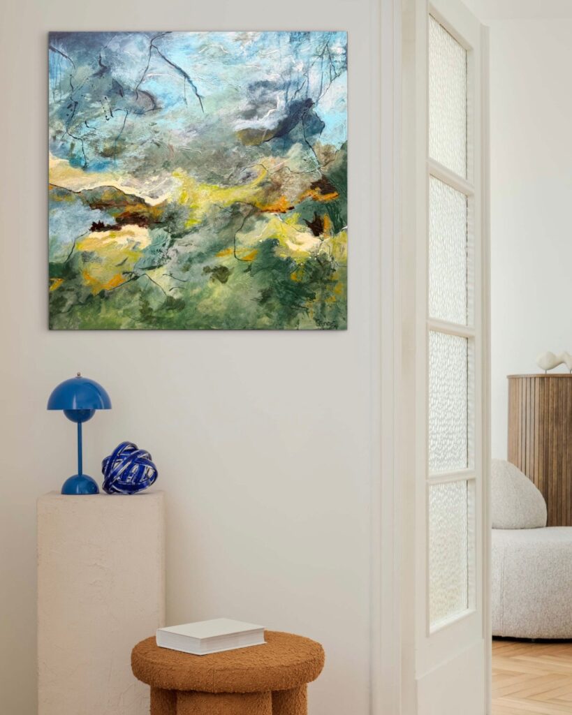 Dette stemningsfulde, abstrakte maleri inviterer beskueren ind i et drømmende landskab, hvor farver og former smelter sammen i en levende og sanselig helhed. Nuancer af blå, grønne og gyldne toner skaber en harmonisk kontrast mellem det rolige og det dynamiske, mens organiske linjer og teksturer giver værket dybde og bevægelse.