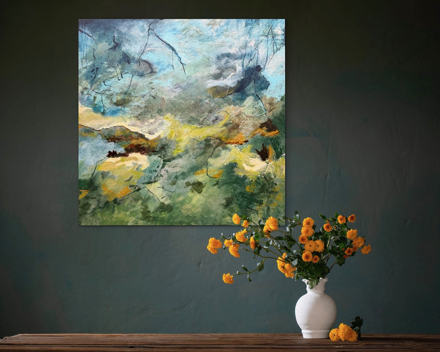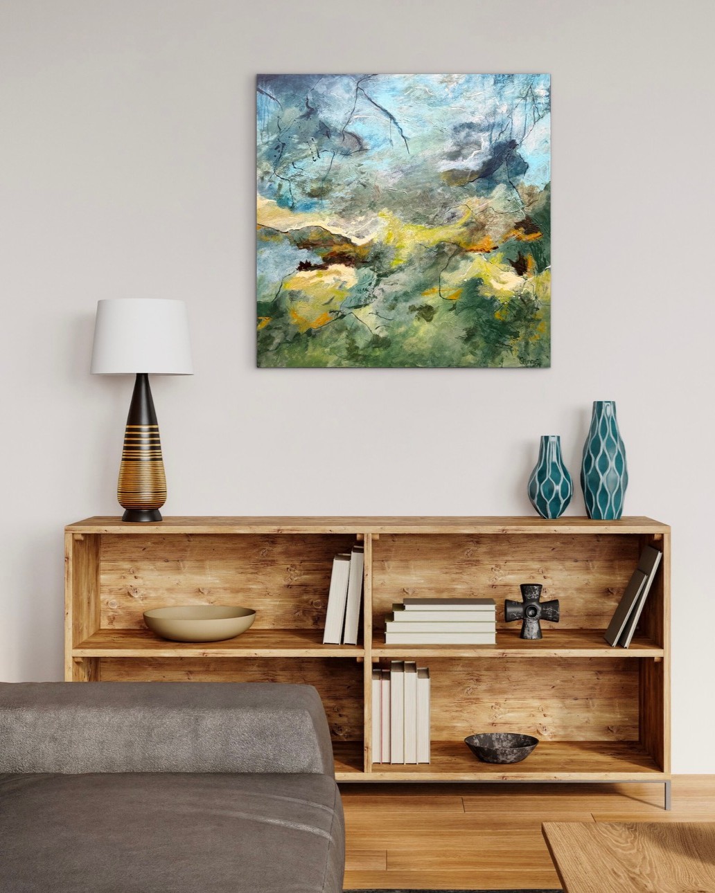 Maleriens åbne udtryk giver plads til personlig fortolkning – det kan minde om horisonter, naturens kræfter eller et indre følelseslandskab. Det er et værk, der ændrer karakter afhængigt af lyset og omgivelserne og tilfører rummet både ro og energi.