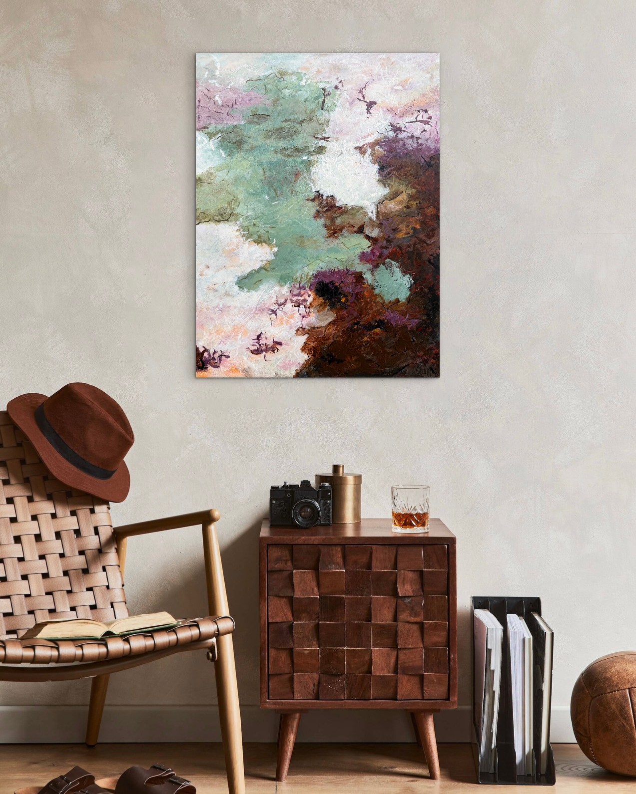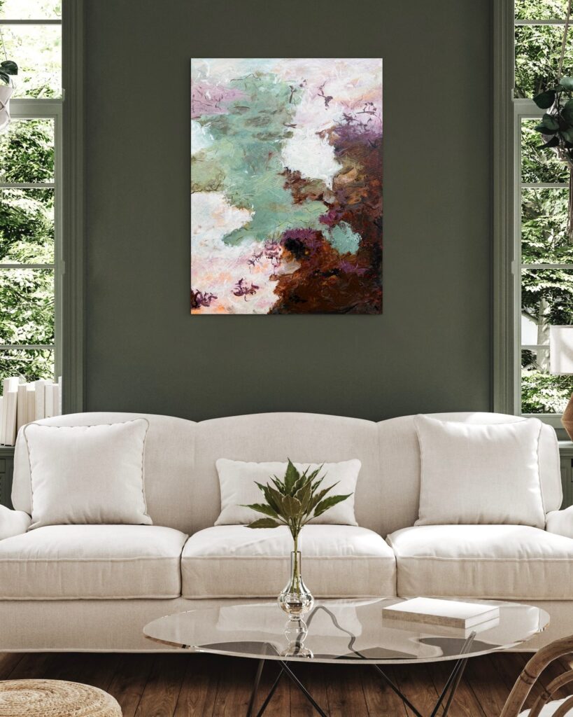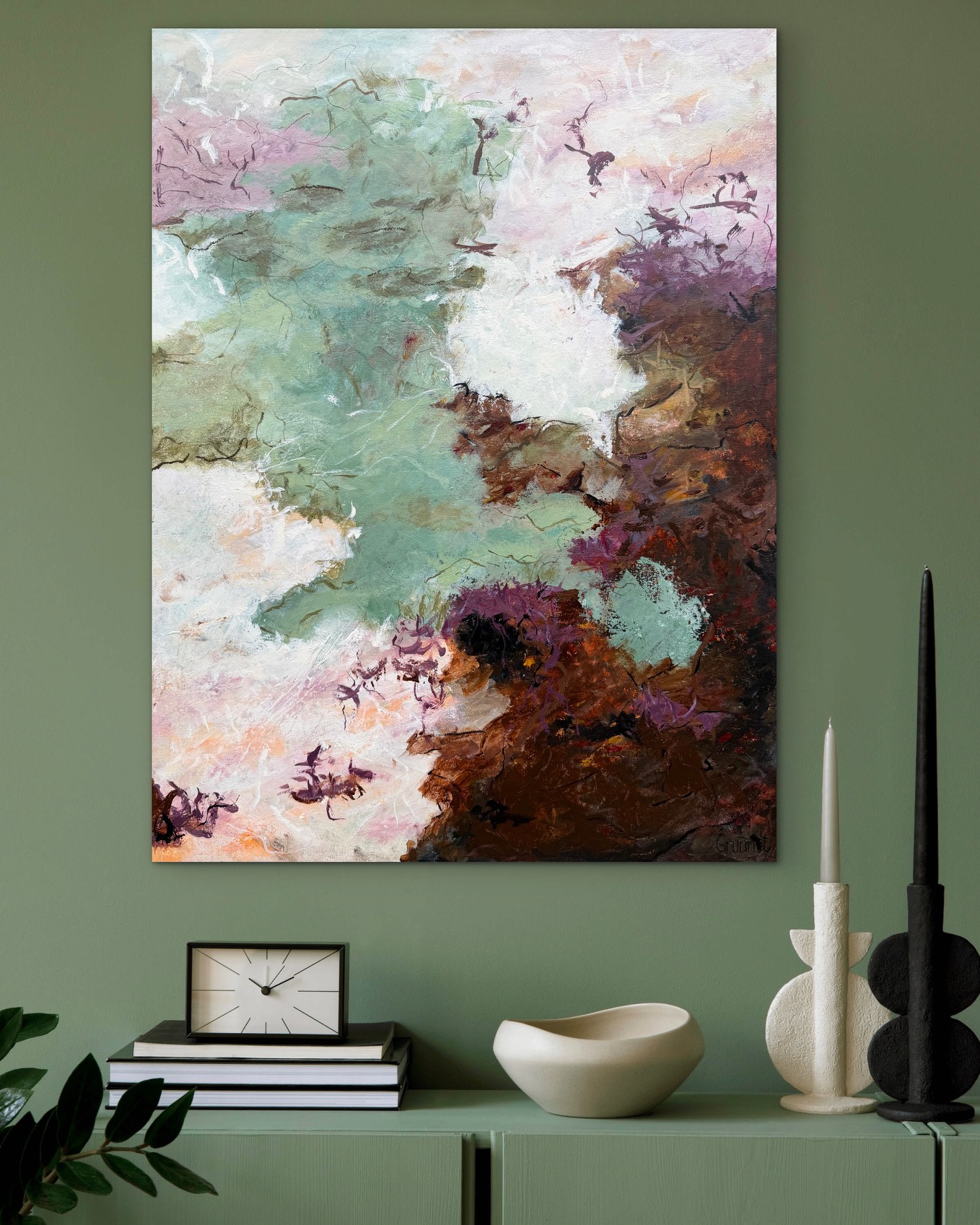 Penselstrøgene er både blide og energiske – nogle steder næsten gennemsigtige, andre steder mere teksturerede og intense. Små, mørke linjer og markeringer er spredt ud over fladen som spor af liv, rødder eller organiske strukturer. Gå på opdagelse og lade egne associationer opstå.