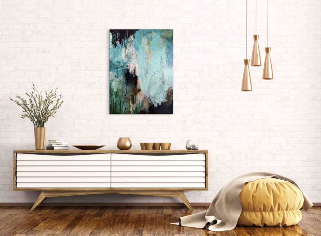 Maleriet er udført i akryl på lærred og bearbejdet med både spartel og pensel, hvilket giver et levende spil mellem struktur og transparens.