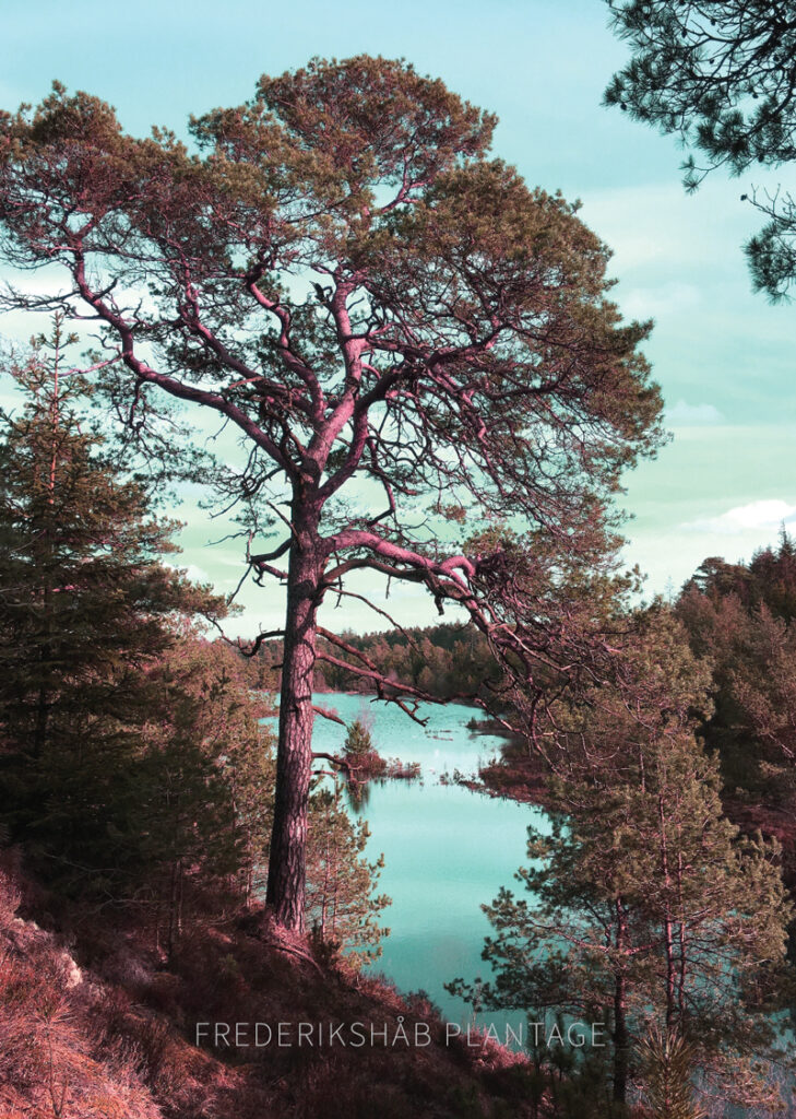 Plakat fra Frederikshåb Plantage – 12 km sydøst for Billund. Her fyrretræ ved søen. Vandet kommer og går… Et oplagt sted at besøge for en gåtur, når du er på ophold i Billund og besøger Legoland, LEGO House eller Lalandia. Her har du din plakat som et minde derfra.