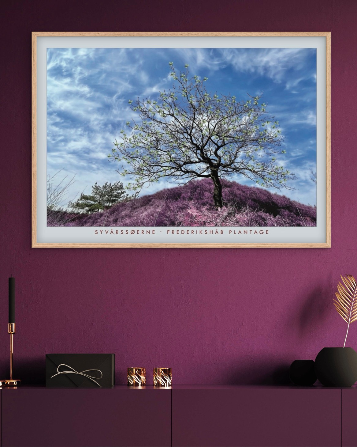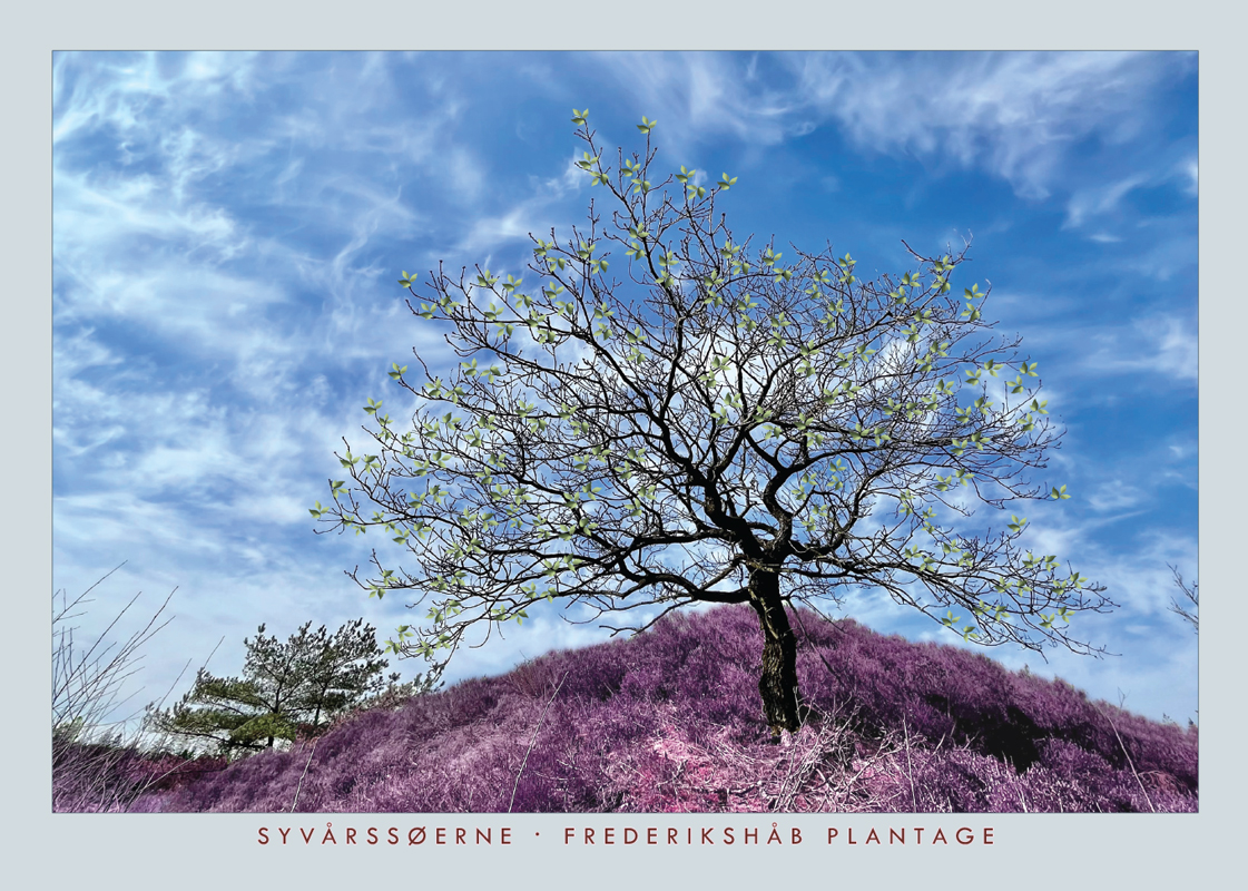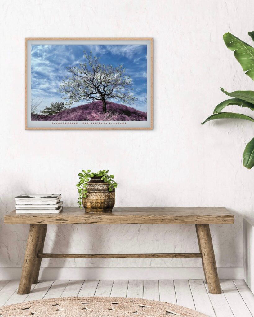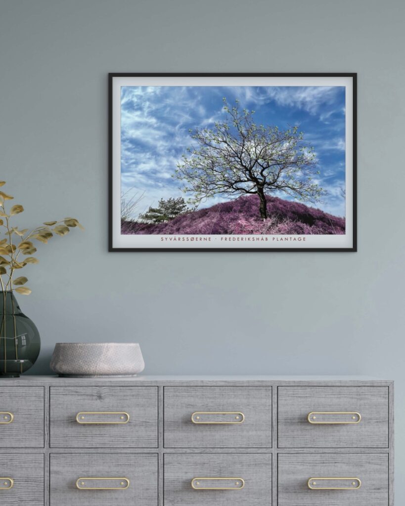 Plakat fra Frederikshåb Plantage – sydøst for Billund. Træet står her skønt på en lyng-top! Den unikke natur er et oplagt sted at besøge for en gåtur, når du er på ophold i Billund og besøger Legoland, LEGO House eller måske er på ophold i det familievenlige Lalandia. Her din plakat som minde fra et skønt område.