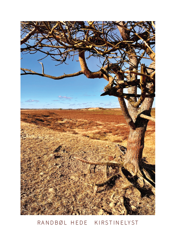 Randbøl Hede. Et kroget træ og “Staldbakkerne” i baggrunden. Plakaten er hvid i bunden – så motivet går ikke helt ud til kant.